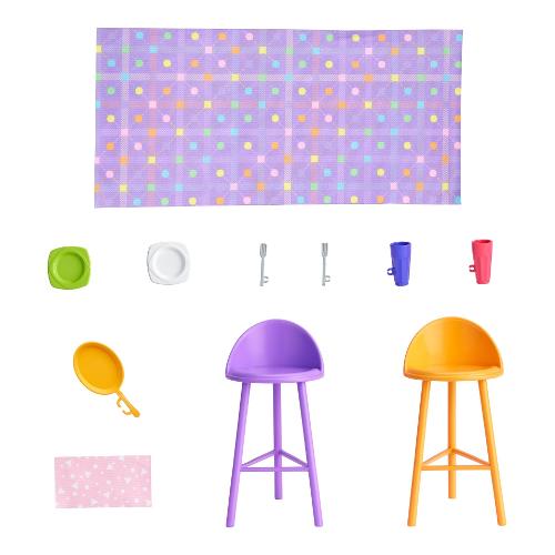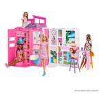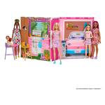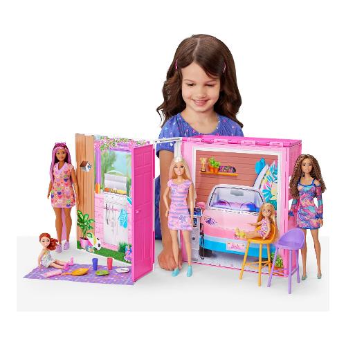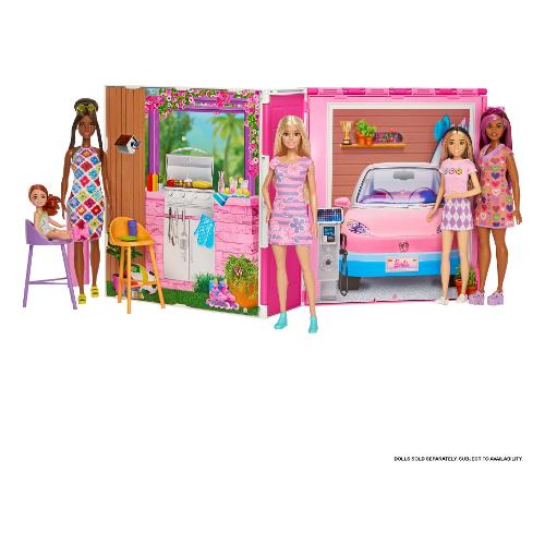 Questa simpatica e colorata casa delle bambole di Barbie pieghevole offre tantissimo divertimento e innumerevoli avventure in vacanza! Include una bambola Barbie e affascinanti accessori decorativi. Include quattro aree di gioco per ispirare tantissime storie: cucina, bagno, camera da letto soppalcata e angolo cinema. Gli accessori decorativi, tra cui stoviglie assortite, 2 sedie, un asciugamano e una coperta, aggiungono dettagli realistici e offrono la possibilità di inventare tantissime storie. Gli elementi grafici come il cestino dei rifiuti, il contenitore per il compost, le piante, i pannelli solari sul tetto e un veicolo elettrico possono aiutare i bambini e le bambine ad adottare abitudini ecostostenibili! La bambola Barbie inclusa si sentirà a casa nella sua adorabile dimora rosa! Dal preparare del cibo nella cucina all'invitare gli amici per una serata, ci sono così tante storie da raccontare!