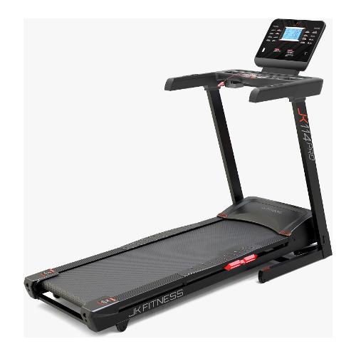l nuovo tapis roulant JK 114-PRO nasce per aggiornare e migliorare la gamma entry-level home fitness incrementando le prestazioni rispetto ai modelli precedenti grazie al nuovo look ancora più moderno e sportivo. Il JK 114-PRO è un tapis roulant elettrico equipaggiato con un potente motore da 2.5 HP con un picco massimo di 3.5 HP che permette di raggiungere una velocità di 18 km/h, con regolazione ad incrementi one-step di 0,1 km/h. Il JK 114-PRO è dotato di una inclinazione elettronica su 18 livelli, che permette di raggiungere una buona pendenza per stimolanti camminate in salita. Per la massima praticità dell’utilizzatore il JK114-PRO è dotato di una serie di pulsanti a comando rapido per velocità ed inclinazione, pratici per far eseguire repentine variazioni della prestazione all’utilizzatore senza distrazioni. L’ampia superficie di corsa di 45 x 140 cm, con nastro spesso 1,6 mm anti-slip, permette confortevoli allenamenti in piena sicurezza grazie anche al sistema di ammortizzazione comfort-flex system, che riesce a limitare i piccoli microtraumi dovuti all’impatto del piede durante la camminata e la corsa. Il quadro di comando del nuovo JK 114-PRO ha una console con un grande display retroilluminato blu multi-informazione, per mantenere sotto controllo tutti i parametri dell’allenamento cardio quali: tempo, distanza, velocità, inclinazione, calorie bruciate, frequenza cardiaca. Il tapis roulant JK 114-PRO è dotato di due ricevitori integrati: per collegare i propri dispositivi elettronici (APP, social e musica); e 5.3 kH per la rilevazione della frequenza cardiaca tramite la fascia cardio toracica proposta come optional. Il tapis roulant JK 114-PRO per essere più vicino alle esigenze e necessità di ogni utilizzatore, è equipaggiato con una serie di programmi per rendere ogni allenamento, il “tuo” allenamento! Sono in dotazione: 1 programma manuale dove tutte le funzioni sono interamente gestite dall’utilizzatore in ogni momento; 3 programmi a target tempo, distanza, calorie; 40 programmi preimpostati con la variazione combinata fra velocità ed inclinazione. Completano la dotazione 5 programmi user; 4 programmi HRC;1 body fat test per calcolare la massa corporea dell’utilizzatore. La console è accessoriata di due casse audio HI-FI, due vani porta borraccia/oggetti, uscita USB per ricarica dispositivi, ingresso audio jack, un cavo jack per collegamento cellulare. È possibile connettere alcune App motivanti e divertenti per rendere le sessioni di allenamento stimolanti e interattive, quali: Zwift, Kinomap (abbonamenti non inclusi). Il JK 114-PRO è un tapis roulant richiudibile.