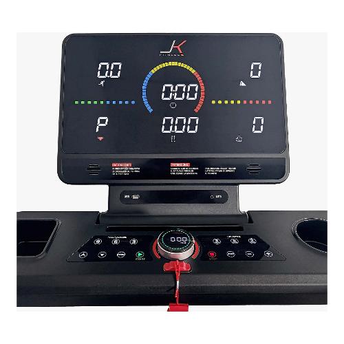 Il nuovo tapis roulant JK 134-PRO nasce per incrementare la gamma entry-level home fitness migliorando le prestazioni rispetto ai modelli precedenti grazie al nuovo look ancora più dinamico e sportivo. Il JK 134-PRO è un tapis roulant elettrico di fascia media nel mondo home fitness equipaggiato con un potente motore da 3.0 HP con un picco massimo di 4.0 HP che permette di raggiungere una velocità di 20 km/h, con regolazione ad incrementi one-step di 0,1 km/h. Il JK 134-PRO è dotato di una inclinazione elettronica su 15 livelli pari al 12% max, che permette di raggiungere un’ottima pendenza per stimolanti camminate in salita. Per la massima praticità dell’utilizzatore il JK134-PRO è dotato di una serie di pulsanti a comando rapido per velocità ed inclinazione, pratici per far eseguire repentine variazioni della prestazione all’utilizzatore senza distrazioni. L’ampia superficie di corsa di 48 x 147 cm, con nastro spesso 1,6 mm anti-slip, permette confortevoli allenamenti in piena sicurezza grazie anche al sistema di ammortizzazione flex system dotato di 4 tamponi in gomma, che riesce a limitare i piccoli microtraumi dovuti all’impatto del piede durante la camminata e la corsa. Il quadro di comando del nuovo JK 134-PRO ha una console con sei finestre a led bianchi ad alta luminosità multi-informazione, per mantenere sotto controllo tutti i parametri dell’allenamento cardio quali: tempo, distanza, velocità, inclinazione, calorie bruciate, frequenza cardiaca. Il tapis roulant JK 134-PRO è dotato di due ricevitori integrati: per collegare i propri dispositivi elettronici (APP, social e musica); e 5.3 kH per la rilevazione della frequenza cardiaca tramite la fascia cardio toracica proposta di serie. Il tapis roulant JK 134-PRO per essere più vicino alle esigenze e necessità di ogni utilizzatore, è equipaggiato con una serie di programmi per rendere ogni allenamento, il “tuo” allenamento! Sono in dotazione: 1 programma manuale dove tutte le funzioni sono interamente gestite dall’utilizzatore in ogni momento; 3 programmi a target tempo, distanza, calorie; 12 programmi preimpostati con la variazione combinata fra velocità ed inclinazione, completano da dotazione 3 programmi HRC;1 body fat test per calcolare la massa corporea dell’utilizzatore. La console è dotata di due casse audio HI-FI, due vani porta borraccia/oggetti, uscita USB per ricarica dispositivi, ingresso audio jack, un cavo jack per collegamento cellulare. È possibile connettere alcune fitness App motivanti per rendere le sessioni di allenamento stimolanti e interattive, quali: Zwift, Kinomap (abbonamenti non inclusi). Il JK 134-PRO è un tapis roulant richiudibile.