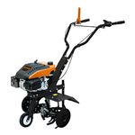 Motozappa a scoppio leggera e robusta, pratica e maneggevole. Doatata di manico ripieghevole per un facile rimessaggio ed impugnature soft-grip per un miglior comfort d'uso. Maniglia e ruota di trasporto anteriore. Trasmissione con ingranaggio a vite senza fine in bagno d'olio.