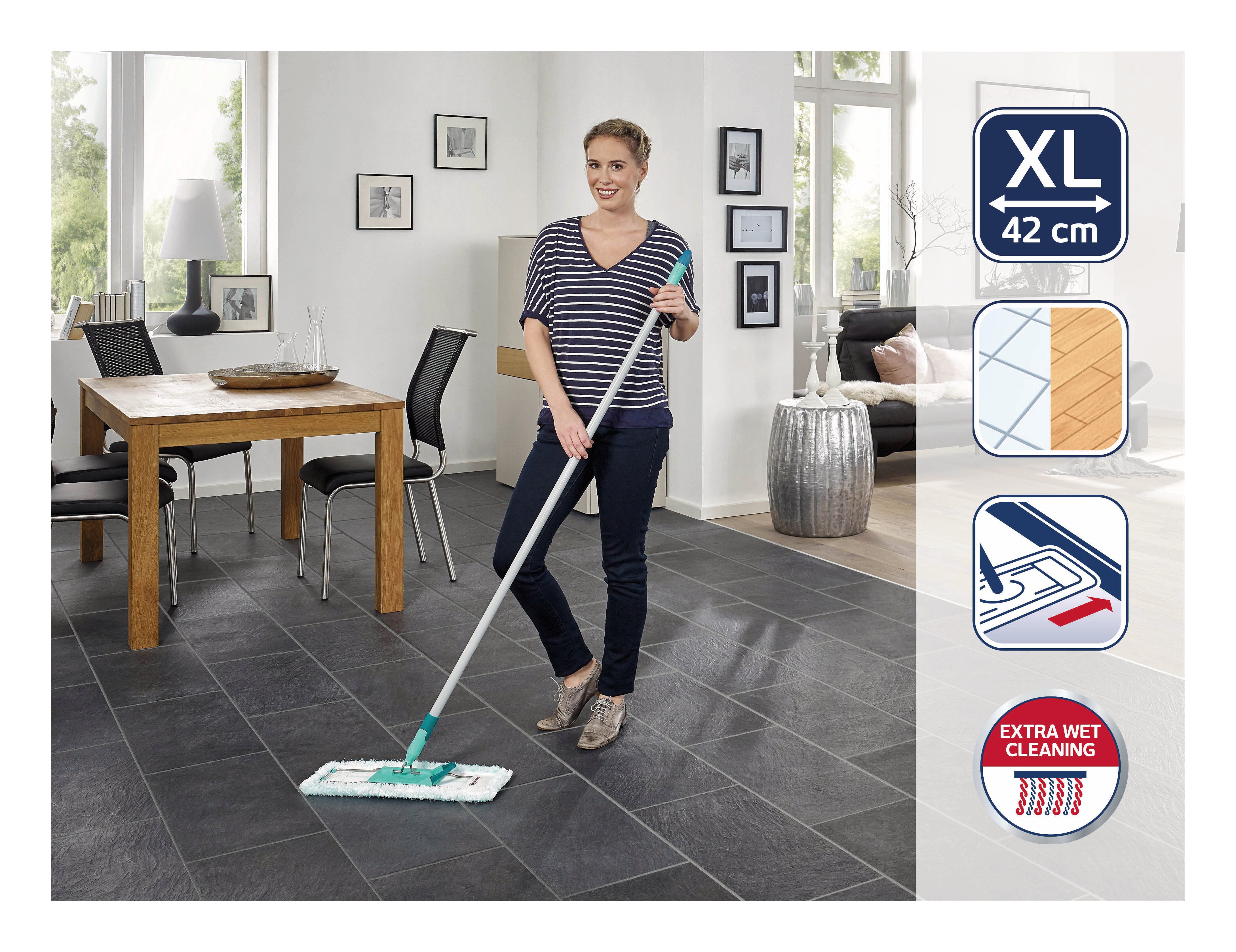 durante la pulizia e agli antiestetici aloni: Profi XL micro duo di Leifheit, grazie al suo rivestimento speciale a 2 fibre, rimuove anche lo sporco più ostinato e