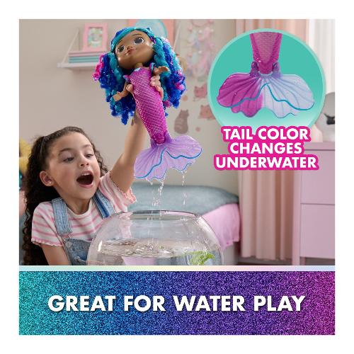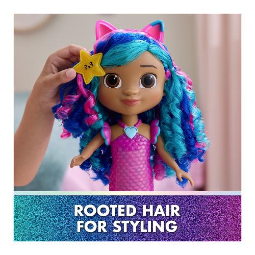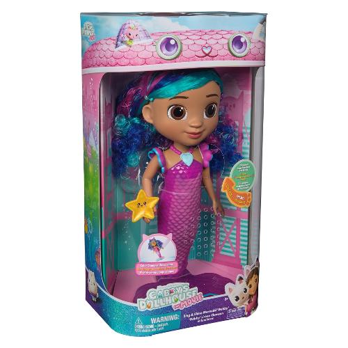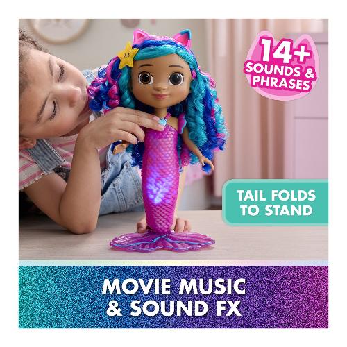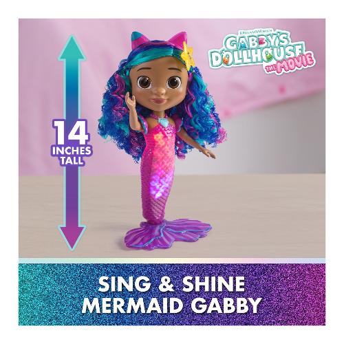 Entra nel magico mondo di Gabby’s Dollhouse: The Movie con la bambola sirena Sing & Shine Mermaid Gabby. Questa incantevole sirena di Gabby è un tesoro di luci e suoni, pronta per infinite avventure. Con una semplice pressione sul suo ciondolo a forma di cuore, Gabby si illumina e riproduce 14 effetti sonori, frasi e musiche tratte dal film Gabby’s Dollhouse. Questa sirena impermeabile meow-mazing cambia colore della coda in acqua calda, per un tocco di magia durante il gioco. Alta oltre 35,5 cm, ha capelli ondulati e accessori adorabili, come una stella marina che può tenere in mano o indossare tra i capelli, per avventure cat-terrific. I giocattoli di Gabby’s Dollhouse sono regali purrfetti per far rivivere i momenti più amati del film e inventare nuove storie nella casa delle bambole di Gabby