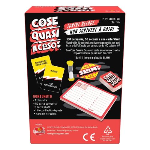Batti il tempo o gioca lo Slam!. La confezione include 1 clessidra, 50 carte categoria, 1 carta Slam, 1 blocco foglio-risposte e il manuale istruzioni