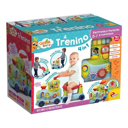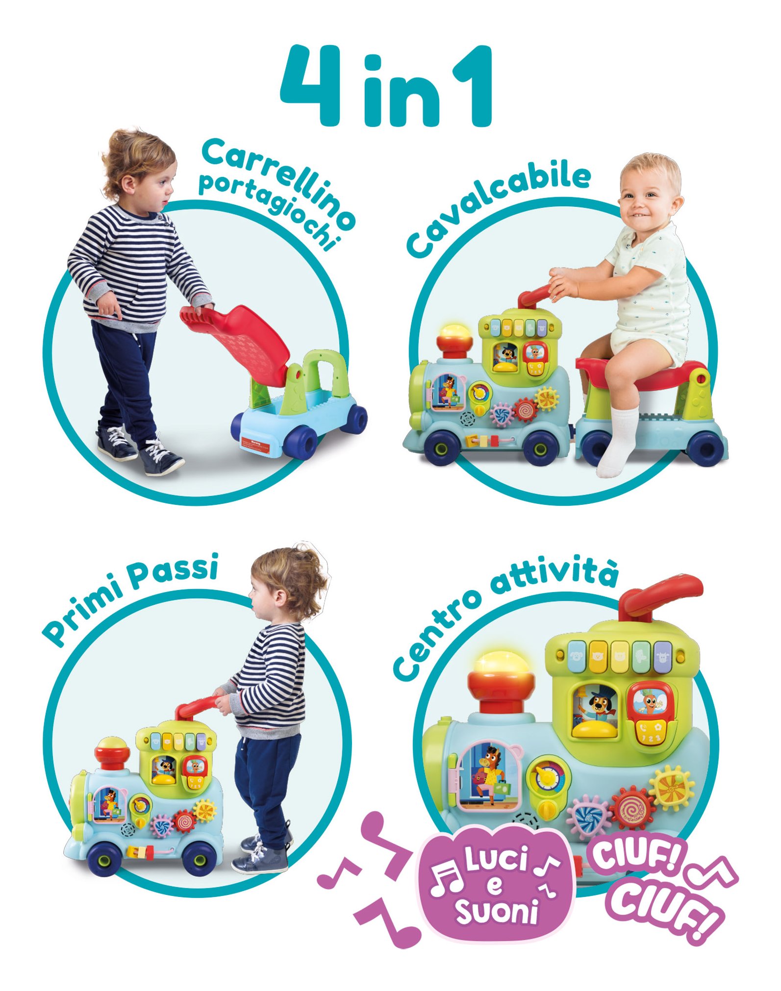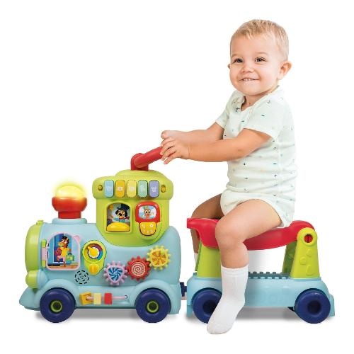 Questo originale trenino è, al tempo stesso, un divertente primi passi, un simpatico cavalcabile, un carrellino portagiochi e un giocattolo educativo elettronico pensato per offrire anche ai più piccoli tante possibilità di gioco e di apprendimento. Con versi, suoni e filastrocche, è ideale per lo sviluppo sensoriale e motorio a partire da un anno di età.