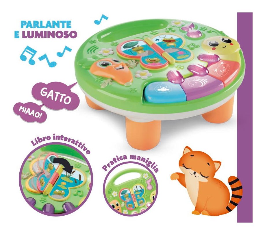 Un coloratissimo tavolino multiattività, ricco di funzioni tutte da scoprire! Premendo i tasti e sfogliando le pagine del libro, il bambino si divertirà ad ascoltare i versi degli animali, dolci