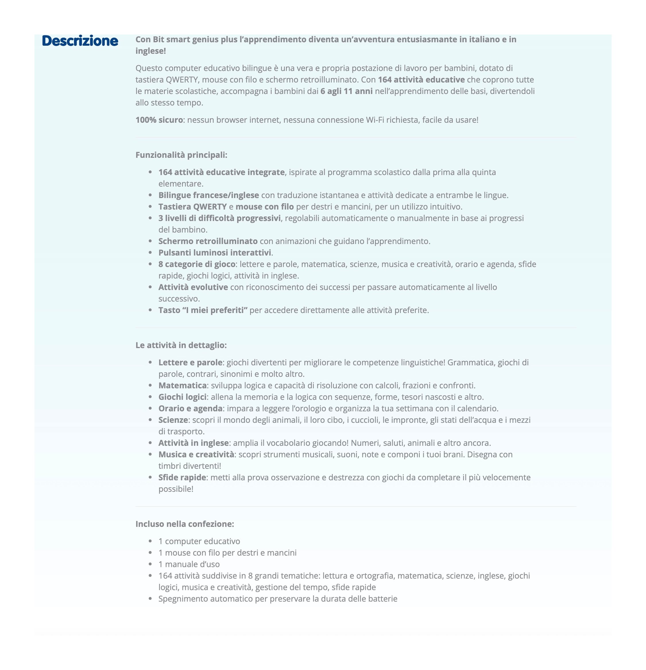 Questo computer educativo bilingue è una vera e propria postazione di lavoro per bambini, dotato di tastiera QWERTY, mouse con filo e schermo retroilluminato. Con 164 attività educative che coprono tutte le materie scolastiche, accompagna i bambini dai 6 agli 11 anni nell’apprendimento delle basi, divertendoli allo stesso tempo.