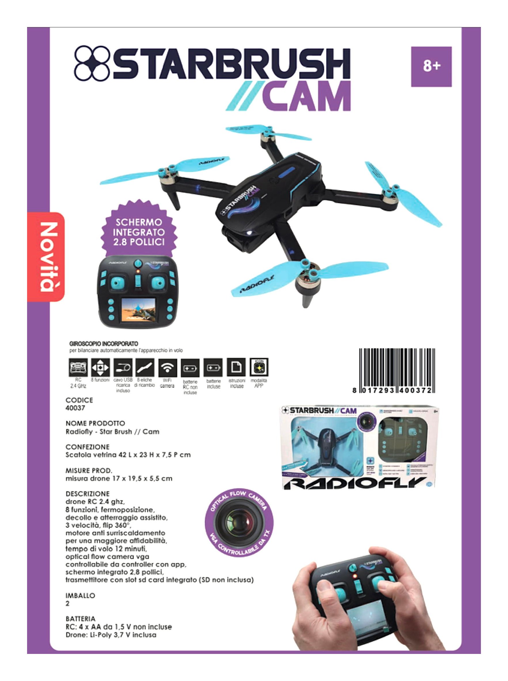Corredato di camera Vga optical flow controllabile dal controllere con schermo integrato 2,8". Trasmettitore con slot sd card integrato (Sd non inclusa)