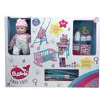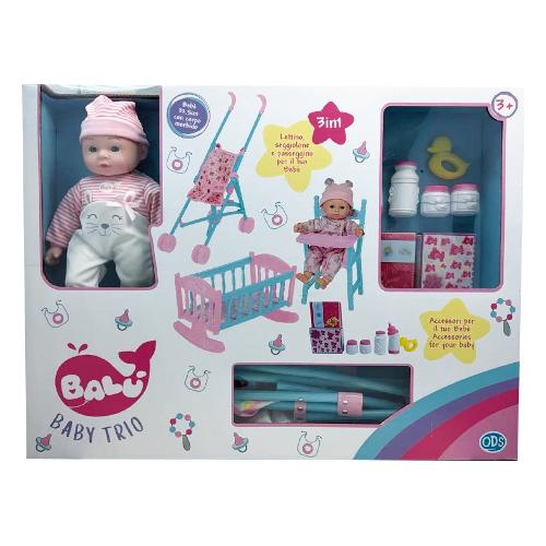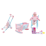 Bambola bebè corpo soffice corredata di lettino, seggiolone, passeggino in plastica e tanti accessori