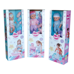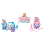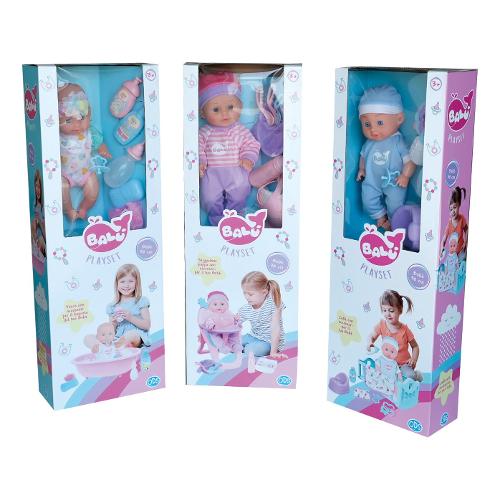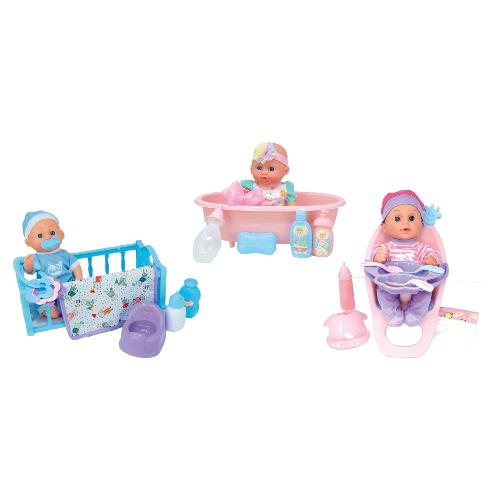 Bambola bebè con corpo rigido e accessori corredata di: bagnetto con vasca oppure seggiolone oppure culla e accessori di gioco