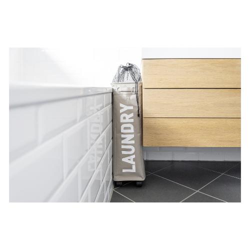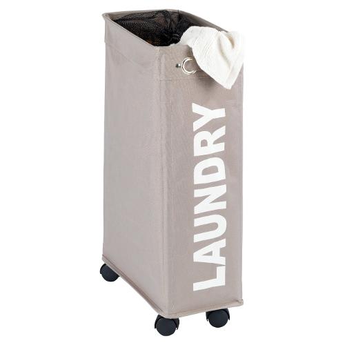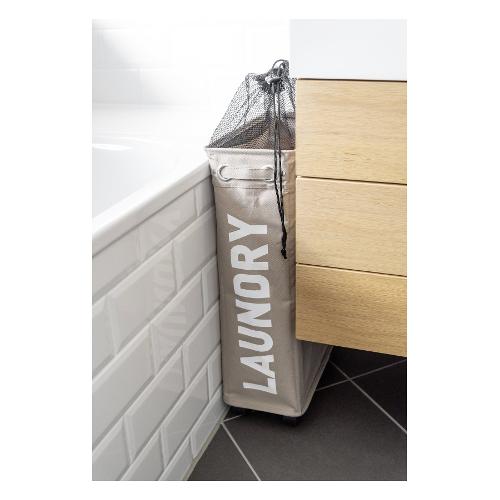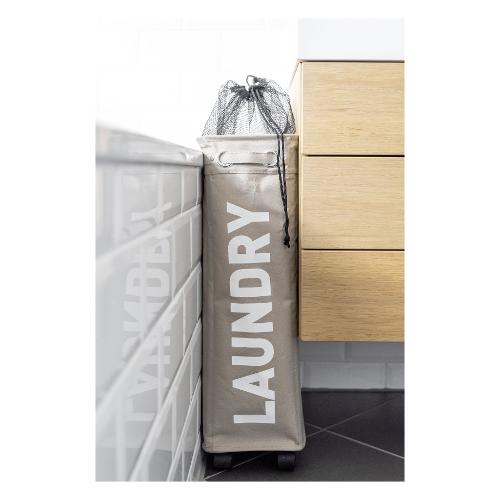 Cosa fare con i numerosi angoli inutilizzati? Grazie al portabiancheria Corno Taupe, anche gli spazi vuoti vicino agli armadi o agli scaffali possono essere da subito utilizzati in maniera eccellente. Il sottile portabiancheria salvaspazio è realizzato in poliestere di alta qualità ed è trasportabile senza problemi grazie alle sue quattro ruote. Grazie al paravista può tenere efficacemente nascosta la biancheria sporca. In questo modo nicchie e angoli diventano un pratico spazio utilizzabile. Il portabiancheria Corno nel colore trendy grigio-talpa ha una capienza di 43 litri. Il portabiancheria è un oggetto che si fa notare grazie alla scritta LAUNDRY.