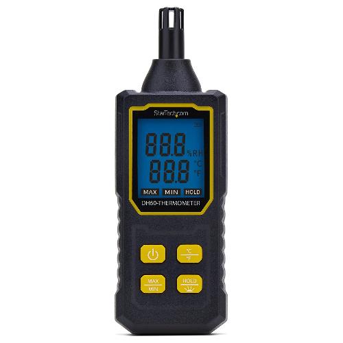 di umidità relativa (UR) dallo 0 al 100% con una risoluzione di 0,1 °C e 0,1% di UR. È possibile passare da un'unità di misura della temperatura all'altra o visualizzare le letture minime e massime con la semplice pressione di un pulsante. L'igrometro portatile è dotato di un display LCD di facile lettura con caratteri grandi per letture rapide e a colpo d'occhio e di una retroilluminazione opzionale per la visibilità in condizioni di scarsa illuminazione. L'indicatore della batteria sullo schermo tiene informato l'utente, mentre la funzione di spegnimento automatico dopo cinque minuti ne massimizza la durata. Il pulsante di blocco dati consente di mantenere l'ultima lettura sullo