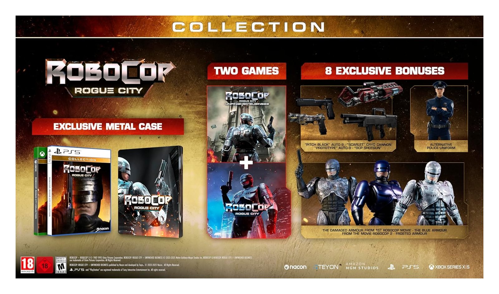 Questa Collector's Edition riunisce le edizioni fisiche Deluxe di RoboCop: Rogue City e Unfinished Business in una custodia in acciaio, insieme a 8 bonus di gioco esclusivi.