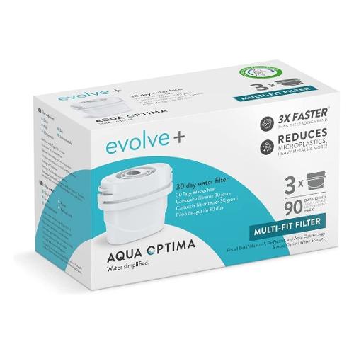 Si consiglia di cambiare il filtro dell'acqua ogni mese circa. Ogni filtro Aqua Optime Evolve+ pulisce 100 litri di acqua del rubinetto (a seconda della qualità e della durezza dell'acqua). In base all'uso tipico, questa confezione da 3 fornirà fino a 3 mesi di acqua potabile più pulita e più pura