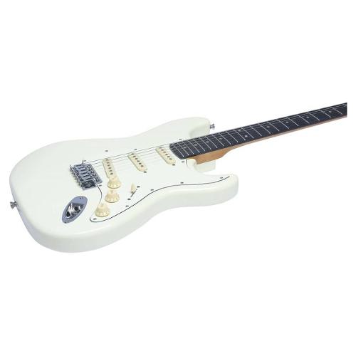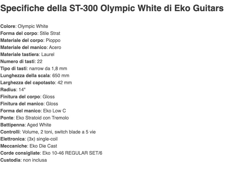 Chitarra elettrica della serie "Tribute 300" ispirata ai celebri modelli strato, in colorazione Olympic White. Presenta corpo in Pioppo, manico in Acero e tastiera in Laurel, con finitura gloss sia sul corpo, sia sul manico. Monta 3 pickup single-coil, controlli di Volume e due toni e switch blade a 5 vie.