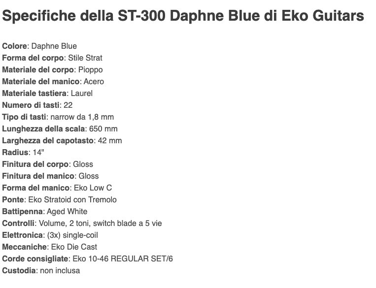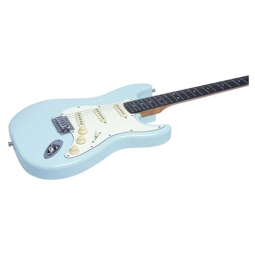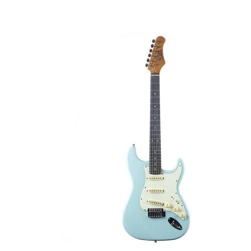 Chitarra elettrica della serie "Tribute 300" ispirata ai celebri modelli strato, in colorazione Daphne Blue. Presenta corpo in Pioppo, manico in Acero e tastiera in Laurel, con finitura gloss sia sul corpo, sia sul manico. Monta 3 pickup single-coil, controlli di Volume e due toni e switch blade a 5 vie.