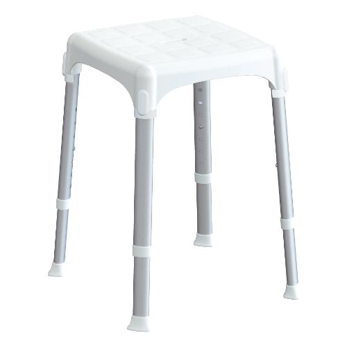 finitura antiscivolo, forata per permettere il deflusso dei liquidi, ne consente l’utilizzo anche sotto la doccia. Le gambe in alluminio anodizzato, telescopiche, permettono di regolare l’altezza della seduta da 39 a 54 cm, per adattarsi alle necessità dell’utente; alle estremità delle gambe quattro puntali in gomma antiscivolo garantiscono stabilità. Si assembla facilmente senza nessun attrezzo. I materiali utilizzati garantiscono massima igiene ed una lunga durata. Non richiede manutenzione ed è facile