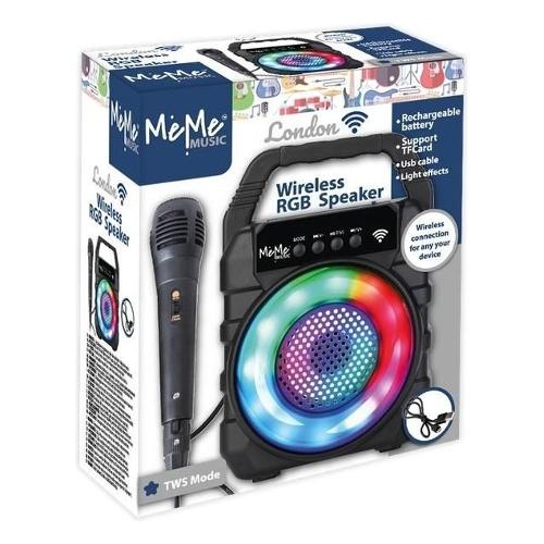 Amplificatore wireless con effetti di luce LED RGB, microfono dinamico. Funzione ON/OFF, presa di ricarica, presa per scheda TF, presa USB, radio FM, pulsante play e pausa, selezione brano successivo/precedente, controllo del volume, modalità TWINS, cavo di ricarica USB incluso