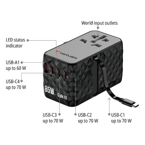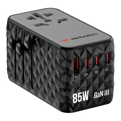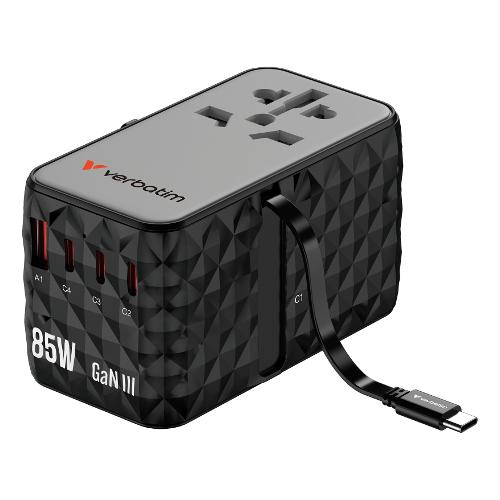 L'adattatore da viaggio Verbatim utilizza la più recente tecnologia GaN, un materiale semiconduttore in grado di supportare efficacemente applicazioni ad alta tensione e ad alta frequenza. Consente ai dispositivi di essere più piccoli, più leggeri e più efficienti in confronto ai prodotti che utilizzano componenti tradizionali a base silicio. Il compatto e potente adattatore universale da viaggio Verbatim Charge 'n' Travel GaN III consente di ricaricare sei dispositivi contemporaneamente attraverso la presa di corrente CA, le tre porte USB-C, la porta USB-A e il cavo USB-C retrattile, offrendo una potenza totale di 85W. Abbastanza per caricare telefoni, tablet e altri dispositivi senza sforzo.