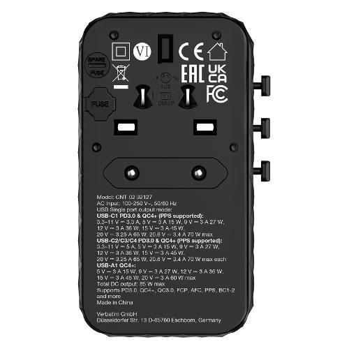 L'adattatore da viaggio universale Verbatim GaN III può essere utilizzato in oltre 180 Paesi: portalo ovunque con te e non resterai mai senza alimentazione. Questa multi-spina world to world ti consentirà di collegarti a qualsiasi presa di corrente locale in tutto il mondo e di ricaricare i tuoi dispositivi a forte consumo energetico, come portatili, smartphone, altoparlanti Bluetooth, tablet, power bank e altro ancora. È sufficiente premere i cursori sul lato della multi-spina per rivelare le tre spine internazionali più diffuse: europea, britannica e americana e ruotare i poli per le prese australiane o cinesi.