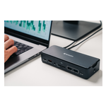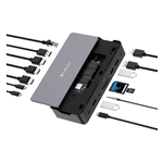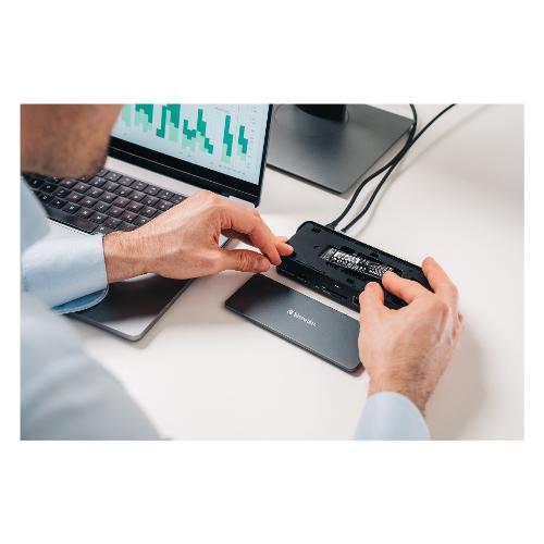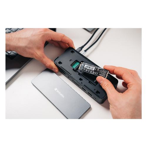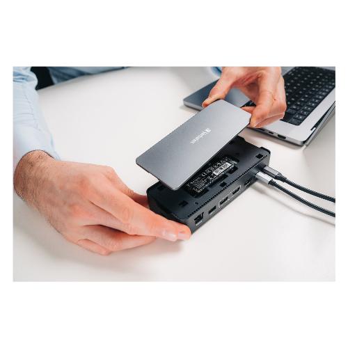Semplifica la connessione di tutti i tuoi dispositivi con la nostra docking station USB-C Pro con alloggiamento SSD. Lo slot SSD da 256 GB integrato offre la possibilità di archiviazione ad alta velocità e grande capacità, migliorando la gestione e l'accessibilità dei dati.