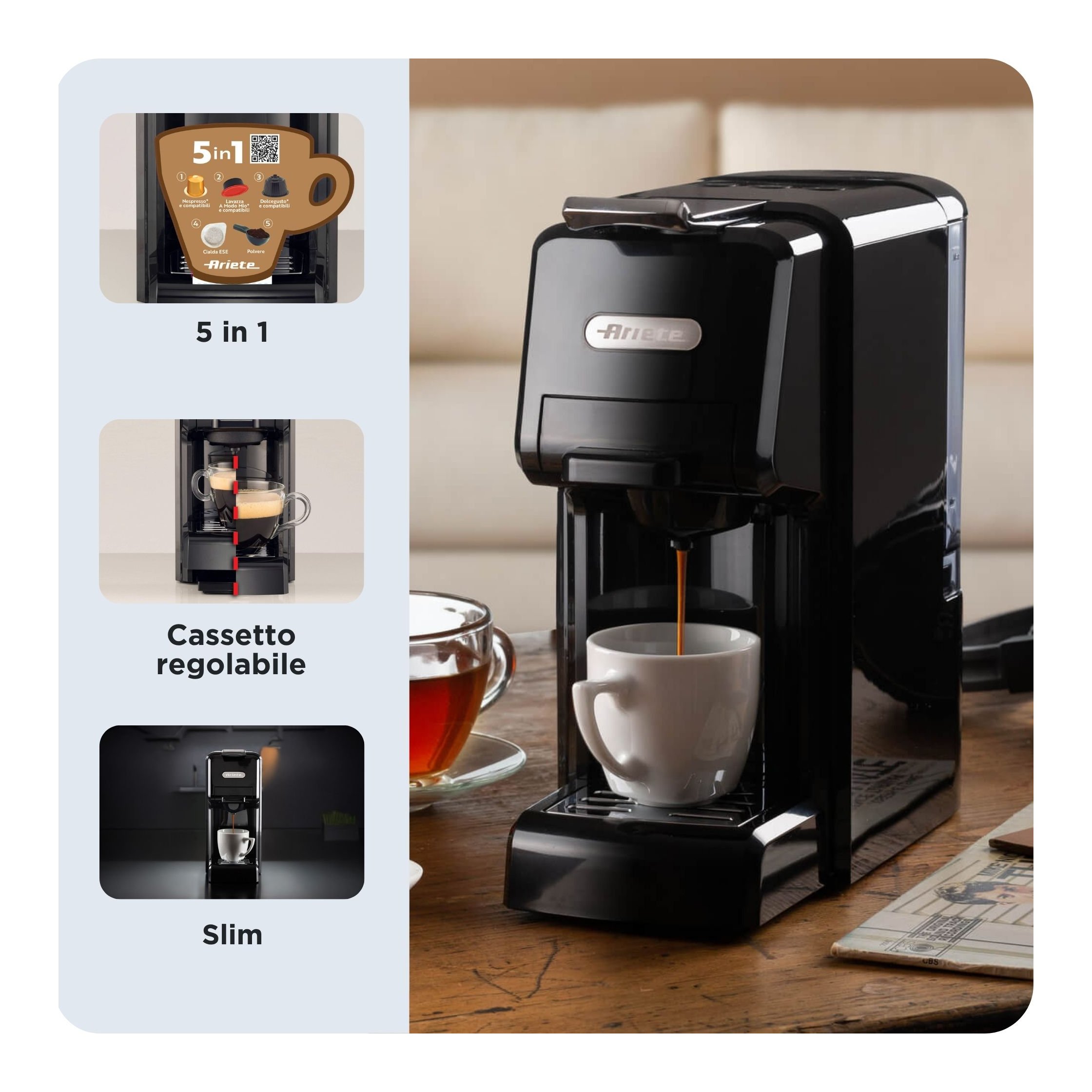 Dalle cialde alle capsule, dalle capsule al caffè in polvere: per ogni occasione la scelta è tua. Con un design compatto che si adatta ad ogni cucina, ufficio oppure negozio, puoi preparare il tuo caffè ovunque e in qualsiasi momento della giornata. scegliendo tra espresso e caffè lungo.