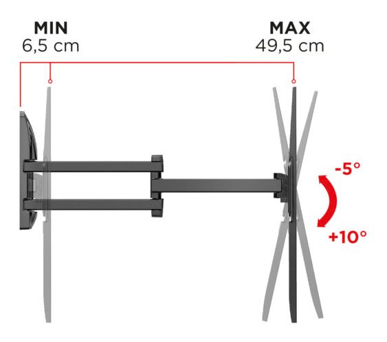 Flatstyle FTR400 è un supporto adatto a tutte le TV con foratura VESA 300-400-600 mm, da 40 a 82 pollici, con una portata massima di 45 kg e distanza da muro di minimo 6,5 cm e massimo 49,5 cm.