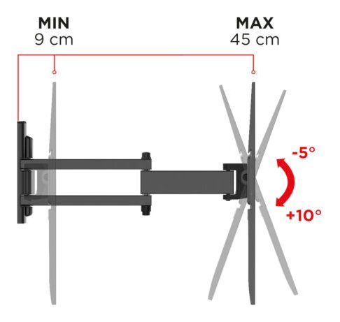 Flatstyle FDR600 è un supporto adatto a tutte le TV con foratura VESA 300-400-600 mm, da 50 a 75 pollici, con una portata massima di 38 kg e distanza da muro di minimo 9 cm e massimo 45.
