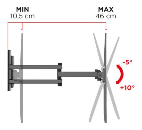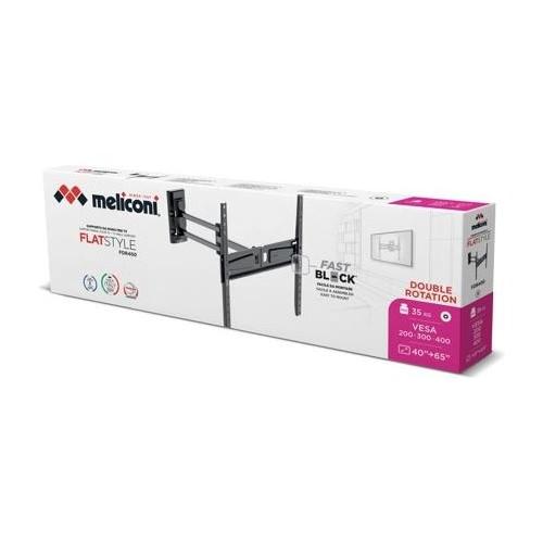 Flatstyle FDR400 è un supporto adatto a tutte le TV con foratura VESA 200-300-400 mm, da 40 a 65 pollici, con una portata massima di 35 kg e distanza da muro di minimo 10,5 cm e massimo 46.