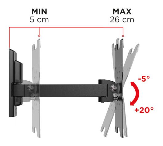 Flatstyle FR200 è un supporto adatto a tutte le TV con foratura VESA 50-75-100-200 mm, da 26 a 45 pollici, con una portata massima di 30 kg e distanza da muro di minimo 5cm e massimo 26 cm.