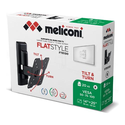 Flatstyle FTR100 è un supporto adatto a tutte le TV con foratura VESA 50-75-100 mm, da 14 a 25 pollici, con una portata massima di 20 kg e distanza da muro di massimo 8,5 cm.