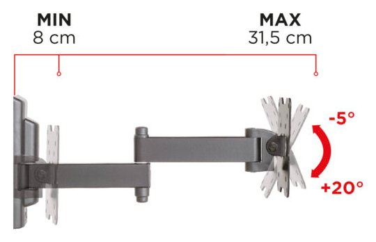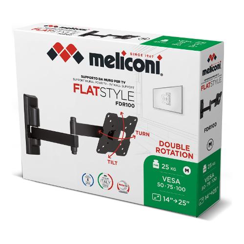 Flatstyle FDR100 è un supporto adatto a tutte le TV con foratura VESA 50-75-100 mm, da 14 a 25 pollici, con una portata massima di 25 kg e distanza da muro di minimo 8 cm e massimo 31,5 cm.