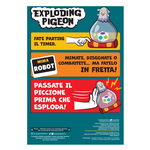 Fate indovinare la parola parlando, mimando o disegnando sullo stesso piccione, combattete a sasso, carta, forbici o simulate lo sbattere d’ali di un piccione, ma attenti a non perder tempo…il timer avanza e il piccione sta per esplodervi in mano!