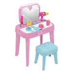 Lo sgabello coordinato, in colore azzurro e decorato con il logo Barbie, è comodo e perfetto per sedersi e giocare davanti alla specchiera.