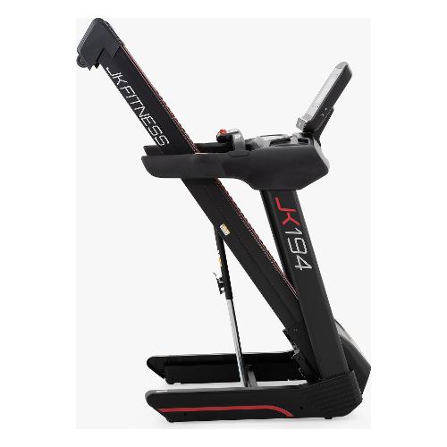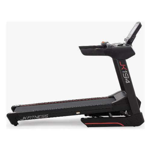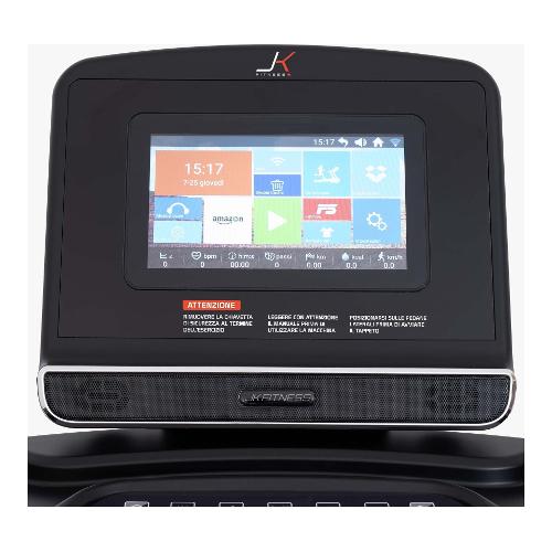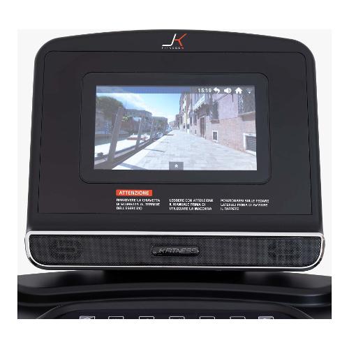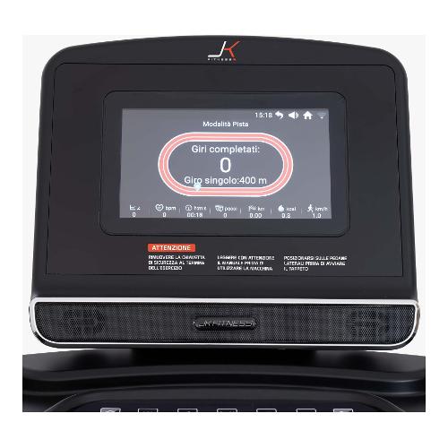 Il nuovo tapis roulant JK 194 entra di diritto ai vertici della gamma home fitness migliorando le caratteristiche tecniche, rispetto alla gamma precedente, il tutto inserito in un contesto più sportivo e interattivo. Il JK 194 è un tapis roulant elettrico di fascia alta nel mondo home fitness equipaggiato con un motore a corrente alternata AC (motore professionale) da 4.0 HP con un picco massimo di 7.0 HP che permette di raggiungere una velocità di 22 km/h, con regolazione ad incrementi one-step di 0,1 km/h. Il JK 194 è dotato di una inclinazione elettronica su 15 livelli, che permette di raggiungere una pendenza max pari al 9,5 %. Per offrire un comfort totale all’utilizzatore, il JK194 è equipaggiato con una serie di pulsanti rapidi per velocità ed inclinazione utili ad eseguire repentine modifiche della prestazione senza distrazioni. L’ampia superficie di corsa di 54 x 160 cm, con nastro spesso 2,5 mm high performance, permette prestazioni in piena sicurezza grazie anche al sistema di ammortizzazione comfort flex system, che riesce a parzializzare i microtraumi dovuti all’impatto del piede durante la camminata/corsa. Il quadro di comando del nuovo JK 194 è composto da uno schermo LCD HD da 10”, per mantenere sotto controllo tutti i parametri dell’allenamento cardio quali: tempo, distanza, velocità, inclinazione, calorie bruciate, n° passi, frequenza cardiaca; inoltre, l’ampio touch-screen enfatizza con video di paesaggi reali precaricati, l’allenamento a casa, dando la sensazione di essere “all’aperto”! Il tapis roulant JK 194 è dotato di due sensori integrati: ricevitore per collegare i propri devices elettronici (per collegamenti a APP, social e musica); e ricevitore 5.3 KH per la rilevazione della frequenza cardiaca mediante la fascia cardio toracica JK offerta di serie. Il tapis roulant JK 194 è una macchina cardio che si adatta al livello di fitness di ogni utilizzatore, essendo equipaggiato di una serie di programmi per rendere ogni allenamento, il “tuo” allenamento! Sono in dotazione: 1 programma manuale dove tutte le funzioni sono interamente gestite dall’utilizzatore in ogni momento; 4 programmi a target con obiettivi pre-determinati per raggiungere una durata in minuti, una distanza in km, un numero passi e un consumo di energia calorie; 1 target n° giri di pista 400 m; 36 programmi pre-impostati con la variazione combinata fra velocità ed inclinazione; 1 HRC con target determinato dall’utente e possibilità di fissare la velocità massima; 1 User programmi personalizzabili dall’utilizzatore stesso, ovvero bisogna impostare ogni singolo step del programma determinando velocità ed inclinazione; 3 virtual wolrd tour. La console è dotata di due casse audio HI-FI, due vani porta borraccia/oggetti, un ingresso audio USB, ingresso audio jack, una uscita USB per ricaricare i propri devices durante l’allenamento. È possibile connettere alcune App motivanti e divertenti per rendere le sessioni di allenamento interattive e stimolanti, quali: Zwift, Kinomap (abbonamenti non inclusi).