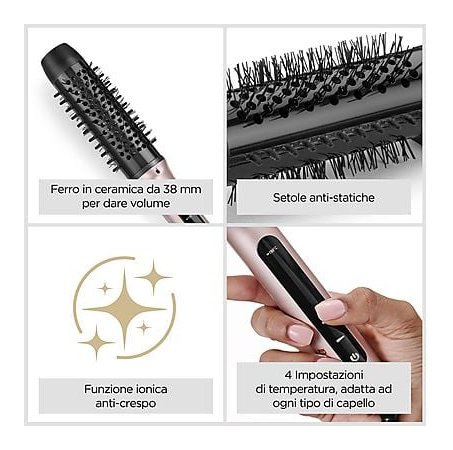 Il sistema ionico di ultima generazione e le setole antistatiche aiutano a controllare l'effetto crespo e i baby hair, lasciando i capelli morbidi, idratati e pieni di lucentezza.