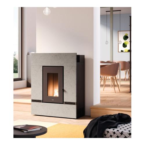 Grande potenza canalizzabile con uscita fumi posteriore e nuovo rivestimento in pietra Serpentino. Caratterizzata da un design minimal e dalle 2 griglie di ventilazione collocate nella parte bassa del fronte, per una migliore distribuzione dell’aria.