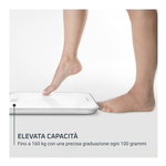 copri Classic, la nostra bilancia da bagno sottile e facile da leggere con un ampio piatto in vetro temperato, uno schermo invisibile e un’illuminazione a LED. La sua elevata capacità di 180 kg è adatta a tutte le corporature: Basta salire sulla bilancia per accenderla, poi scegliere tra unità metriche e imperiali. La bilancia si spegne automaticamente dopo pochi secondi di inutilizzo.