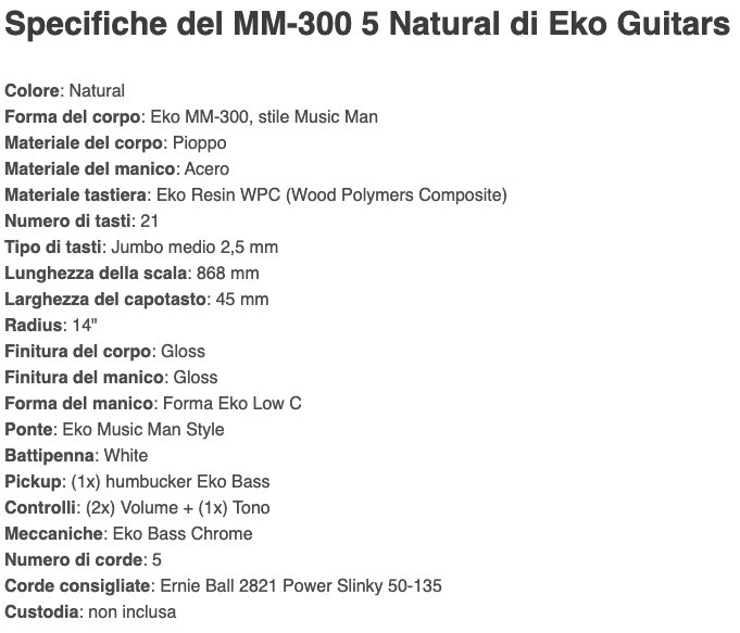 MM-300 5 Natural è il basso elettrico 5 corde della serie "300" di Eko Guitars, ispirato al leggendario basso Stingray.