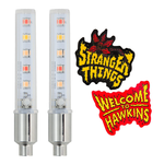 Illumina le tue uscite con lo stile retrò di Stranger Things. Questo set include due luci LED per bici con sette modalità di lampeggiamento e due adesivi fosforescenti. Perfetti per i fan della serie e per essere visibili con un tocco anni '80.