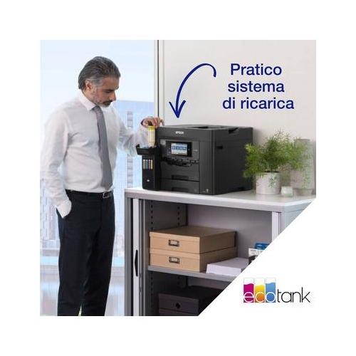 Con le funzioni di stampa, scansione, copia e fax, questa stampante EcoTank è intuitiva e assicura un bassissimo costo pagina. L’ampia capacità di caricamento della carta è garantita dai due vassoi frontali da 250 fogli e dall’alimentatore posteriore da 50 fogli; l’ADF in A4 contiene fino a 50 fogli. I documenti in A4 possono essere gestiti rapidamente grazie all’elevata velocità di stampa e scansione. Stampa in tutta comodità con la stampa da mobile, con la connettività di rete Wi-Fi ed Ethernet, e grazie al display touch-screen da 10,9 cm.