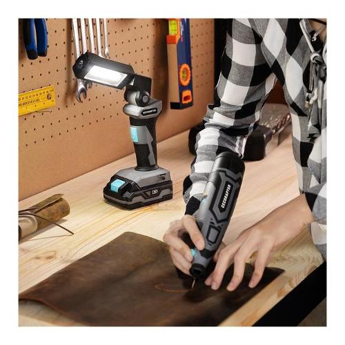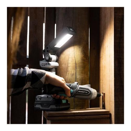 Luce da lavoro con batteria 20 V 2000 mAh, 5 W di potenza e fino a 4 ore di autonomia. Integra una luce laterale da 300 lumen e una luce frontale da 250 lumen.
