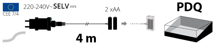 Consente di alimentare dispositivi che richiedono batterie 2xAA senza la necessità di sostituirle continuamente. Lunghezza cavo 4m. Trasformatore SELV di sicurezza con Timer 8 ore On (16 ore Off) disinseribile tramite pulsante luminoso. Spina Europea Shuko CEE 7/4, uso Interno.