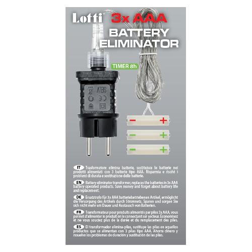 Consente di alimentare dispositivi che richiedono batterie 3xAAA senza la necessità di sostituirle continuamente. Lunghezza cavo 4m. Trasformatore SELV di sicurezza con Timer 8 ore On (16 ore Off) disinseribile tramite pulsante luminoso. Spina Europea Shuko CEE 7/4, uso Interno.