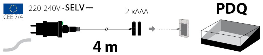 Consente di alimentare dispositivi che richiedono batterie 2xAAA senza la necessità di sostituirle continuamente. Lunghezza cavo 4m. Trasformatore SELV di sicurezza con Timer 8 ore On (16 ore Off) disinseribile tramite pulsante luminoso. Spina Europea Shuko CEE 7/4, uso Interno.