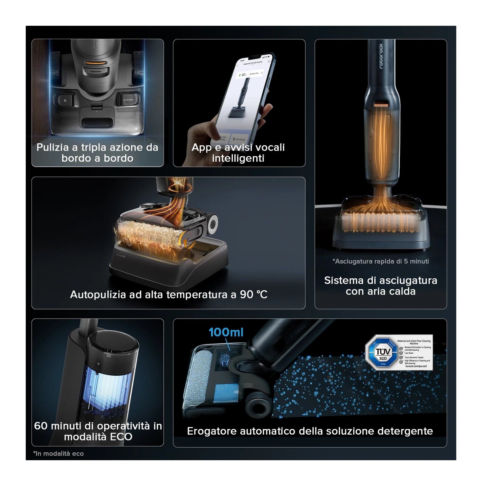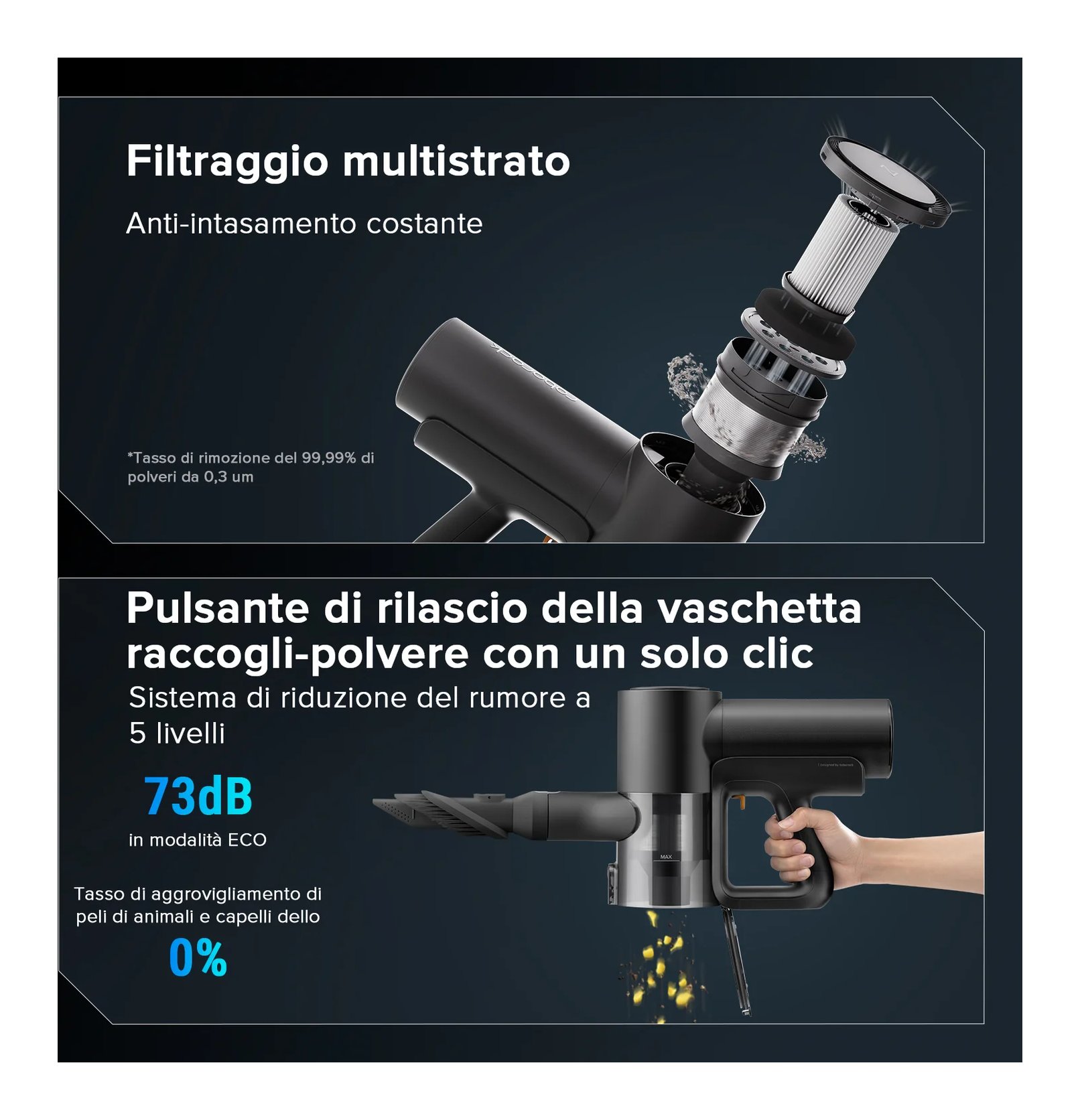 Grazie a un'unità di alimentazione staccabile compatibile con entrambi i modelli e tre testine della spazzola intercambiabili, il dispositivo si trasforma agevolnte in un aspirapolvere per umido e secco, in uno solo per la polvere senza fii o in un dispositivo di controllo degli acari della polvere.