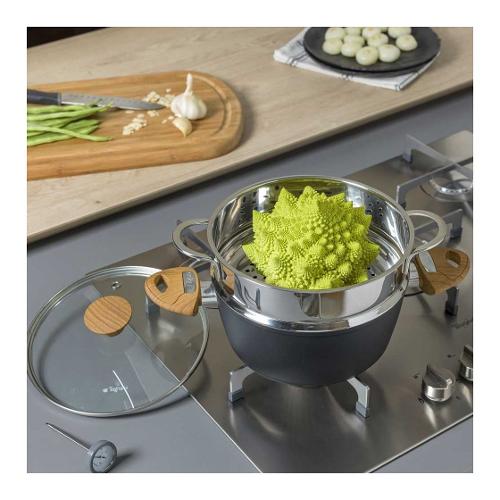 Rendi la tua cucina più versatile con il Set Friggivapor Multifunzione 22 cm della linea Country Chic di Tognana. Questo innovativo set ti permette di friggere, cuocere a vapore e cucinare in modo sano, combinando praticità e stile in un unico prodotto. Realizzato in alluminio forgiato con rivestimento Longlife Diamond Tech, arricchito con particelle di diamante, garantisce massima resistenza, antiaderenza e facilità di pulizia. Il coperchio in vetro temperato con termometro integrato consente di controllare la cottura senza aprire il coperchio, mantenendo calore e sapori. Il set include cestelli per friggere e per la cottura a vapore, permettendoti di preparare piatti leggeri, nutrienti e gustosi per tutta la famiglia. I manici con finitura soft touch effetto legno assicurano una presa sicura e confortevole, mentre il design elegante della linea Country Chic si adatta a qualsiasi cucina. Compatibile con tutti i piani cottura, inclusi quelli a induzione, e lavabile in lavastoviglie, il Set Friggivapor Multifunzione Tognana Country Chic è la soluzione ideale per chi cerca praticità, versatilità e design in cucina.