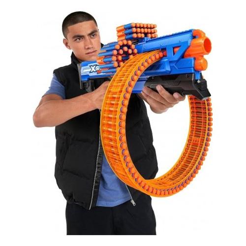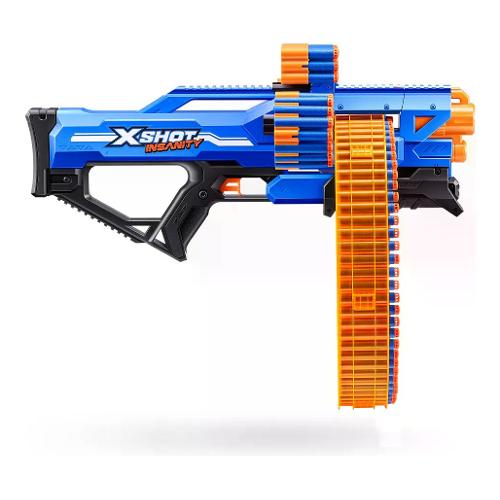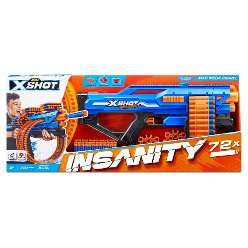 Zuru lancia la sua prima gamma di blaster modulari. X-Shot Insanity Mad Mega Barrel include 72 dardi e puo' sparare fino a 27 metri. Potrai sparare 40 dardi in 10 secondi, il modello Insanity Mad Mega assicura azione e divertimento. Affina la tua mira e preparati ad affrontare le sfide piu' avvincenti. Il set contiene un fucile con cartuccera rotante e 72 dardi con portata fino a 27 metri.