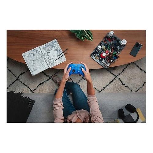 Scopri il design modernizzato del controller wireless Xbox Shock Blue, con le sue superfici testurizzate e la geometria raffinata, per un comfort di gioco migliorato. Alimentato da 2 batterie Stilo AA.