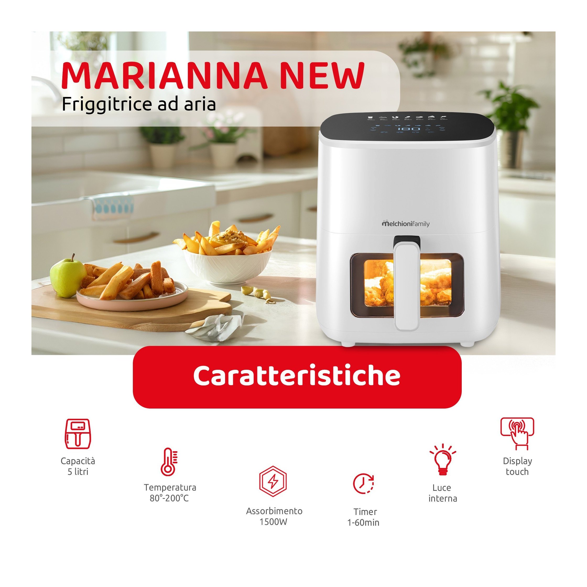 Dotata di un display touch e di un sistema di temperatura regolabile tra 80°C e 200°C, la friggitrice si adatta facilmente a ogni tipo di preparazione. Il timer da 1 a 60 minuti consente di programmare con precisione la cottura, evitando sprechi di energia. Facile da pulire e sicura: Il contenitore antiaderente evita che il cibo si attacchi, rendendo la pulizia rapida e senza sforzo.