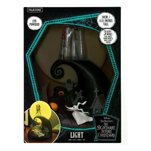 Illumina la tua casa con questa stravagante luce diorama ispirata a Nightmare Before Christmas. La lampada raffigura Jack Skeletron e Sally appollaiati sulla cima della famosa collina a spirale. È dotata di una suggestiva lampada a LED a forma di luna, con due diverse modalità di luce: bianco caldo e bianco freddo. Basta cambiare l'impostazione desiderata ruotando la zucca del cimitero